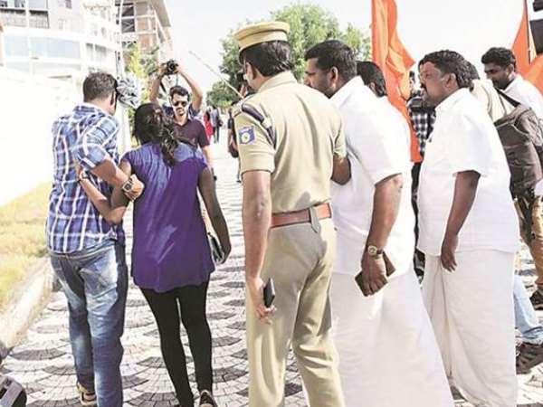 कोच्चि में मरीन ड्राइव के पास बैठे प्रेमी जोड़ों को शिवसेना के कार्यकर्ताओं ने पुलिस कर्मियों और मीडिया के लोगों के सामने परेशान किया।