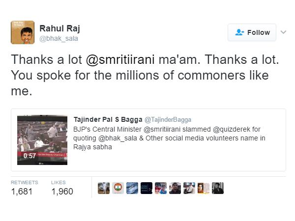 डेरेक ने भक साला और माहीविराम हैंडल का नाम लेते हुए कहा कि हम कहां जा रहे हैं, सर? ये ट्विटर ट्रोल्, इन्हें पैसे और न्यौता दिय जाता है। यह किसी से छिपा नहीं है। यह बात किताब में भी छप चुकी है। इन्हें डिजिटल पार्टी के लिए पीएम के घर बुलाया जाता है। सदन में डेरेक के आरोपों का जवाब देते हुए राज्य सभा सांसद स्मृति ईरानी ने किसी का नाम नहीं लिया, हालांकि @bhak_sala ट्विटर हैंडल से राहुल राज ने स्मृति का शुक्रिया अदा किया।