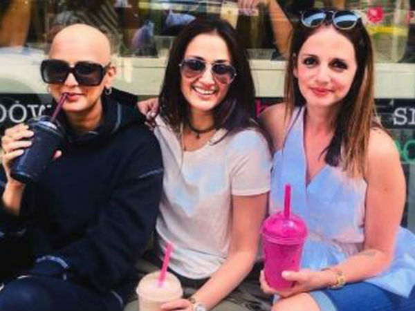 इस तस्वीर में सोनाली अपनी अभिन्न सहेलियों गायत्री जोशी और सुजैन खान के साथ नजर आ रही हैं, ये तीनों किसी रेस्त्रां के बाहर बैठी हैं, इस फोटो में सोनाली पहली बार बाल्ड लुक में हैं और मुस्कुराते नजर आ रही हैं, उन्होंने ब्लैक कलर की ड्रेस पहनी हुईं हैं।