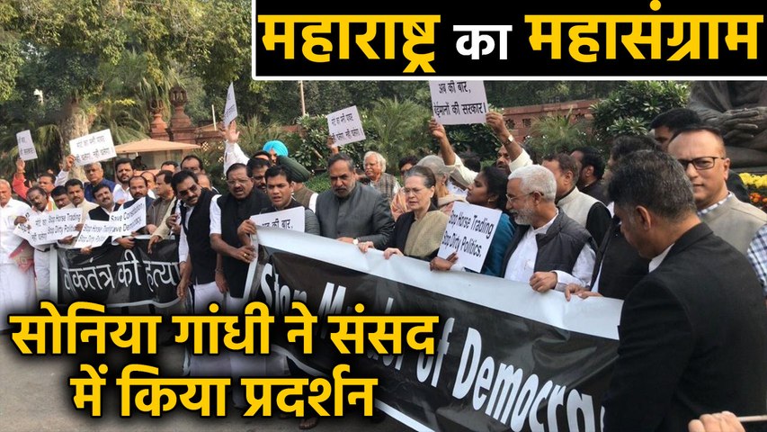 महाराष्ट्र में सरकार गठन के खिलाफ उतरीं सोनिया गांधी, संसद में किया विरोध प्रदर्शन