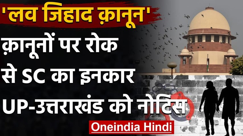 Love Jihad law:सुप्रीम कोर्ट (Supreme Court) ने कथित विवादास्पद 'लव जिहाद कानून' (Love Jihad law) पर रोक लगाने से इनकार कर दिया है। अलबत्ता बुधवार को सुप्रीम कोर्ट ने इस मामले में उत्तर प्रदेश (Uttar Pradesh) और उत्तराखंड (Uttarakhand) सरकार को नोटिस जरूर जारी किया है। लाइव लॉ की जानकारी के मुताबिक सुप्रीम कोर्ट ने यह नोटिस याचिकाकर्ताओं की ओर से धर्मांतरण विरोधी कानूनों (anti-conversion law) को चुनौती देने वाली याचिकाओं पर सुनवाई करने के बाद यह नोटिस जारी किया है। लेकिन, कोर्ट ने इस कानून पर रोक नहीं लगाकर फिलहाल दोनों राज्य सरकारों को बहुत बड़ी राहत दी है।