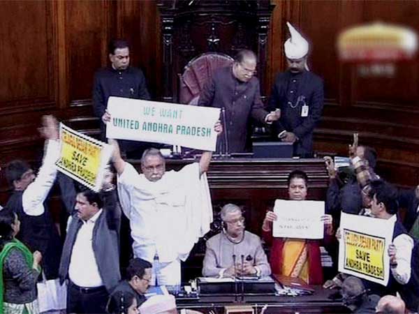 सुशील कुमार शिंदे ने जब आंध्र प्रदेश पुनर्गठन विधेयक को सदन में चर्चा के लिए रखा उस समय तेदेपा, तृणमूल, शिवसेना सहित विभिन्न दलों के सदस्य आसन के समक्ष आकर बैनर और तख्तियां दिखाते हुए नारेबाजी कर रहे थे। इनमें से कई सदस्यों ने नारेबाजी करते हुए शिंदे की तरफ बढ़ने का प्रयास किया। लेकिन प्रमोद तिवारी सहित सत्तापक्ष के कई सदस्यों ने शिंदे को चारों ओर से घेर रखा था। वहीं बिल का विरोध कर रहे सीमांध्र के सांसदों ने राज्यसभा में विपक्ष के नेता अरुण जेटली को भी सदन में नहीं बोलने दिया।