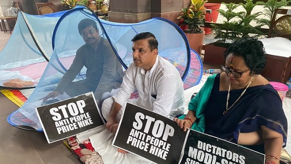 बता दें कि संसद से निलंबित सभी सांसद 50 घंटे के धरने पर बैठे हैं। कुल 27 सांसदों को निलंबित किया गया है, जिसमे 23 राज्यसभा के सांसद हैं और 4 लोकसभा के सांसद हैं। इन लोगों को सदन के भीतर गलत व्यवहार करने की वजह से बाहर कर दिया गया है। ये सभी सांसद पूरे मानसून सत्र के लिए निलंबित किए गए हैं। ये सांसद मांग कर रहे हैं कि उनके निलंबित को वापस लिया जाए और जनता की आवाज को सदन के भीतर उठाने दिया जाए। धरने पर बैठे सांसद हाथ में तख्तियां लेकर बैठे हैं, जिसपर महंगाई समेत कई मुद्दे लिखे हैं।