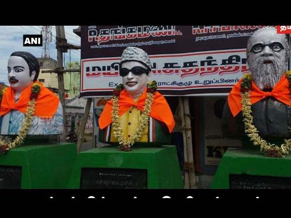 तमिलनाडु के दो पूर्व सीएम और पेरियार की मूर्ति को पहना दिया भगवा गमछा
