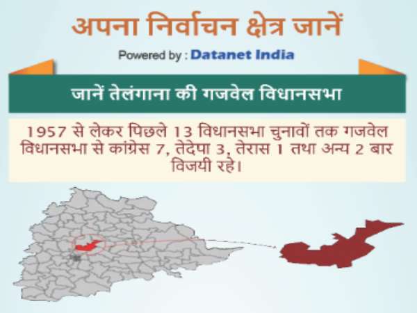 हैदराबाद। तेलंगाना में सिद्दीपेट जिले की गजवेल विधानसभा सीट टीआरएस के लिए अहम है। इस सीट से राज्य के कार्यवाहक मुख्यमंत्री के चंद्रशेखर राव चुनाव मैदान में उतरे हुए हैं। इस सीट की सबसे खास बात यह है कि 1957 से लेकर अभी तक इस सीट ज्यादातर समय कांग्रेस के कब्जे में रही है। आंकड़ों पर नजर डाले तो 1957 से लेकर पिछले 13 विधानसभा चुनावों तक गजवेल विधानसभा से कांग्रेस 7, तेदेपा 3, तेरास 1 और अन्य पार्टी को 2 बार जीत मिली है।