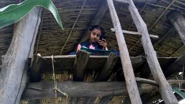 मचान पर बैठकर कर रही ऑललाइन पढ़ाई