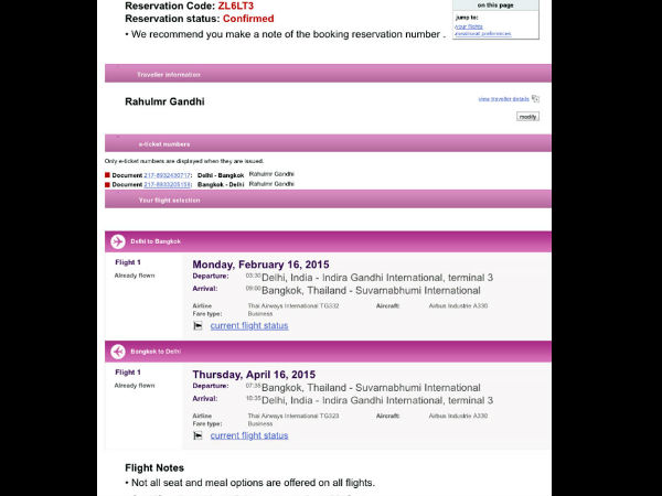 जी हां राहुल गांधी सोमवार 16 फरवरी 2015 को दिल्ली के इंदिरा गांधी इंटरनेशल एयरपार्ट टर्मिनल 3 से थाई एयरवेज से बैंकॉक के लिए रवाना हुए थे। वो बिजनेस क्लास में थे और विमान का नंबर TG332 था। टिकट में आप देख सकते हैं कि राहुल गांधी की 16 अप्रैल की वापसी की टिकट थी। विमान को 10 बजकर 35 मिनट पर लैंड होना था लेकिन विमान 40 मिनट देरी से पहुंचा।
