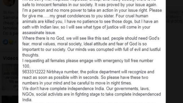 ये नंबर ना केवल फेसबुक पर बल्कि ट्विटर समेत लगभग सभी सोशल मीडिया प्लैटफॉर्म पर वायरल हो रहा है। कई यूजर्स ट्विटर पर इसे रीट्वीट कर रहे हैं। गौरतलब है कि हैदराबाद में एक हाईवे ब्रिज के नीचे महिला डॉक्टर की जली हुई लाश मिली थी। पीड़िता के परिजनों का कहना है कि उसकी स्कूटी रास्ते में खराब हो गई थी और कुछ लोगों ने उसे मदद ऑफर की। इसके अगले दिन यानी फोन करने के करीब 9 घंटे बाद जला हुआ शव बरामद हुआ। अपराध में शामिल चारों आरोपियों को गिरफ्तार कर लिया गया है।