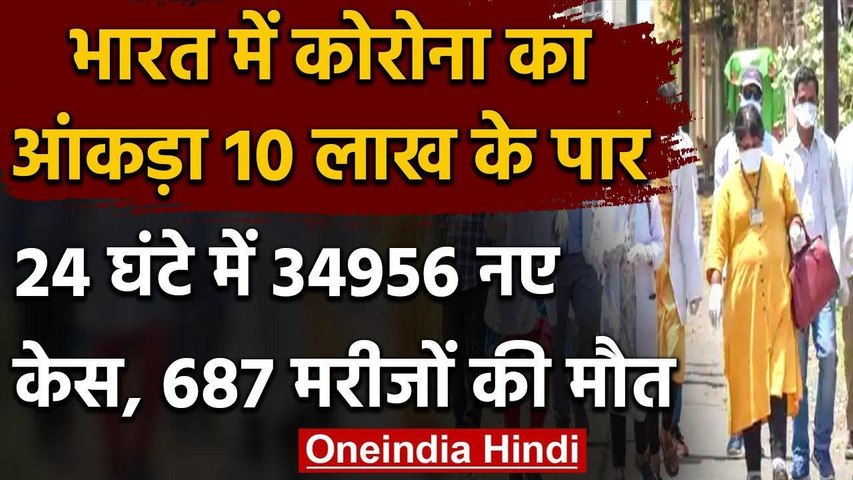 नई दिल्ली। भारत में कोरोना वायरस (कोविड-19) के मामलों की संख्या तेजी से बढ़ती जा रही है। स्वास्थ्य और परिवार कल्याण मंत्रालय के ताजा आंकड़ों के अनुसार देश में कोरोना वायरस के मामलों की संख्या 10 लाख के पार पहुंच गई है। बीते 24 घंटों में सर्वाधिक 34,956 नए मामले सामने आए हैं और 687 मरीजों की मौत हुई है। अब कुल मामलों की संख्या 10,03,832 हो गई है, जिसमें 3,42,473 सक्रिय मामले, 6,35,757 ठीक/डिस्चार्ज /माइग्रेट मामले और 25,602 मौतें शामिल हैं।