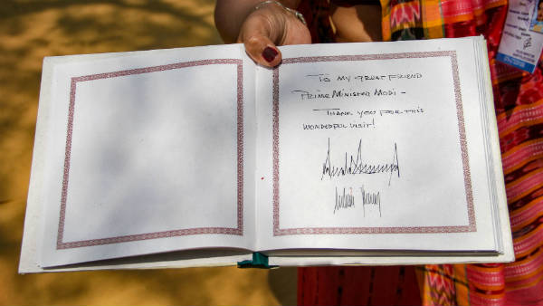 बापू के साबरमती आश्रम पहुंचे डोनाल्ड ट्रंप, महात्मा गांधी के जिक्र के बिना साइन की विजिटर्स बुक