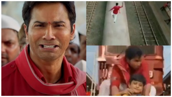 असल में फिल्म में एक रेलने स्टेशन का सीन है। जिसमें एक महिला का बच्चा रेलवे ट्रैक पर जाकर बीच में बैठ जाता है और पीछे से ट्रेन आ रही होती है। वरुण धवन पटरी पर बैठे बच्चे को बचाने के लिए चलती हुई ट्रेन के ऊपर रेलवे स्टेशन के पुल के ऊपर से छलांग लगाते हैं। वरुण धवन पटरी पर स्पीड से दौड़ रही ट्रेन की छत पर उससे भी ज्यादा तेज दौड़ने लगते हैं। दौड़ते-दौड़ते वो ट्रेन की कोच से छलांग लगाकर वह दूसरे कोच पर पहुंच जाते हैं। वरुण धवन इतना तेज भागते हैं कि ट्रेन के इंजन तक पहुंच जाते हैं और फिर ट्रेन के आने से पहले पटरी पर कूदकर वहां बैठे बच्चे को उठाकर बचा लेते हैं।