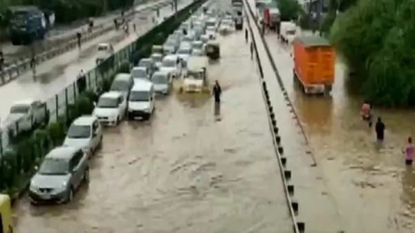 बारिश के चलते दिल्ली-गुरुग्राम एक्सप्रेस-वे पर भरा पानी, लगा लंबा जाम