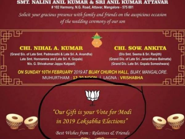 सूरत के जोड़े के कार्ड की तरह ही मंगलौर की भी एक वेडिंग कार्ड की फोटो सोशल मीडिया में वायरल हो रही है। ये कार्ड निहार और अंकिता की शादी का है। इस कार्ड में भी लगभग उसी तरह से आखिर में बीजेपी के लिए वोट की मांग की गई है। साथ ही लिखा है कि 2019 में मोदी को वोट हमारा गिफ्ट है। ये शादी फरवरी में है।