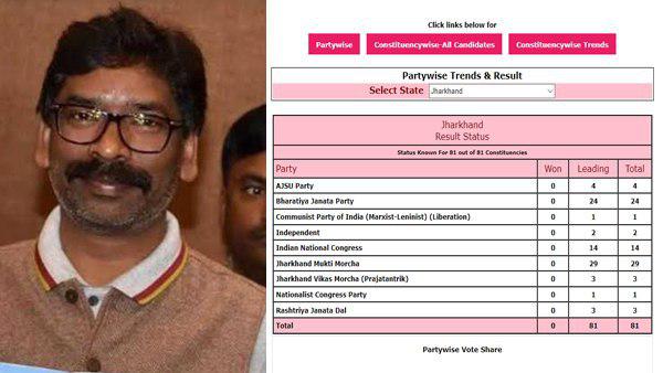 नई दिल्ली- झारखंड में महागठबंधन की जीत लगभग निश्चित है और हेमंत सोरेन के अगले मुख्यमंत्री बनने का रास्ता भी लगभग साफ हो चुका है। महागठबंधन खेमे में जश्न भी मनाए जा रहे हैं, लेकिन तथ्य ये है कि चुनाव आयोग ने दोपहर बाद साढ़े तीन बजे तक एक भी चुनाव परिणाम पर मुहर नहीं लगाई है। चुनाव आयोग के आधिकारिक वेबसाइट पर सिर्फ रुझान दिख रहे हैं, जिसमें महागठबंधन सत्ताधारी भाजपा पर भारी बढ़त बना चुका है और वह रुझानों में ही स्पष्ट बहुमत भी हासिल कर चुका है।