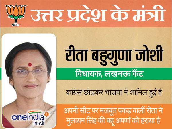 कैबिनेट मंत्री के रूप में एक ही महिला (डॉ. रीता बहुगुणा जोशी) को शामिल किया गया है। कांग्रेस छोड़कर बीजेपी छोड़कर आयीं रीता बहुगुणा ने लखनऊ कैंट से भारी जीत दर्ज की हैं। उन्होंने सपा की कद्दावर नेता अपर्णा यादव को पराजित किया है।वर्ष 2012 के विधानसभा चुनाव में लखनऊ कैंट विधानसभा क्षेत्र से कांग्रेस की टिकट पर जीती थीं। इस बार भी वह इसी सीट से भाजपा से विधायक बनी हैं।