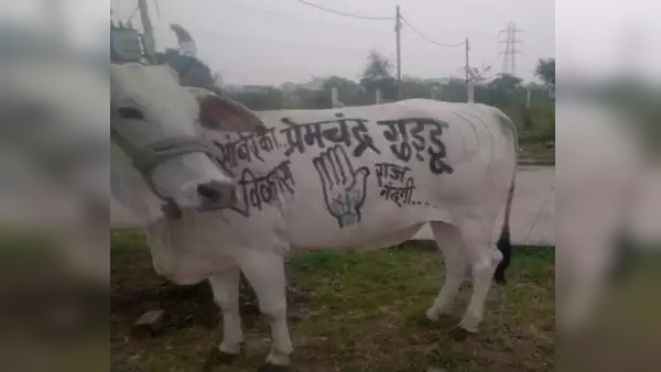मध्य प्रदेश उपचुनाव : गाय के शरीर पर कांग्रेस प्रत्याशी प्रेमचंद गुड्डू का चुनाव प्रचार