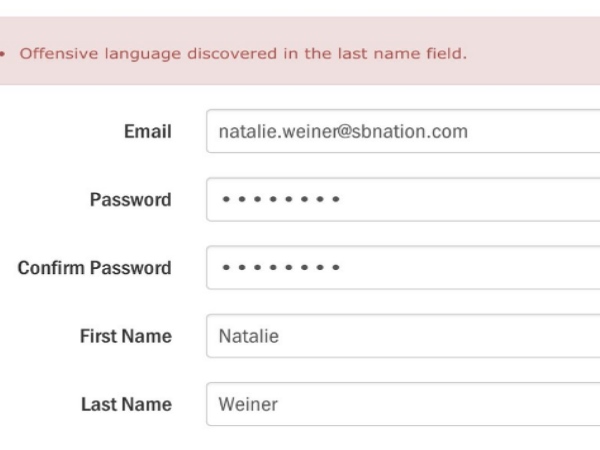 नई दिल्ली। एसबी नेशन की एक स्पोर्ट्स जर्नलिस्ट नताली विनर के साथ ऐसा वाकया हुआ है कि उसे जानकार वो खुद हैरान हैं। दरअसल नताली को एक वेबसाइट ने अप्रत्यासित रूस से उनके एकाउंट को ब्लाक कर दिया। लेकिन एकाउंट ब्लाक के पीछे वेबसाइट ने जो रिजन बताया है वो हैरान करने का वाला है। वेबसाइट के एल्गोरिदम को अंतिम नाम फील्ड में आक्रामक शब्द का पता चला। जिसके बाद उसने ब्लाक कर दिया।