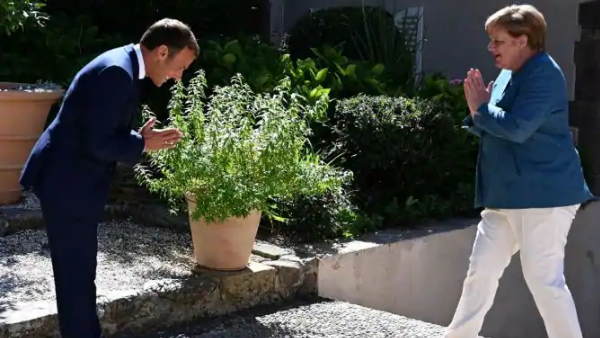 फ्रांस के राष्ट्रपति इमैनुएल मैक्रों ने इस वीडियो को ट्विटर पर शेयर किया है। वीडियो दक्षिण फ्रांस के फोर्ट ऑफ ब्रेगंकान स्थित मेडिटरेनियन हॉलीडे रिट्रीट का है। जर्मन चांसलर एंजेला मर्केल के यहां पहुंचने पर फ्रांस के राष्ट्रपति ने उनका स्वागत हाथ जोड़कर किया। जवाब में एंजेला मर्केल ने भी हाथ जोड़कर इमैनुएल मैक्रों का अभिवादन स्वीकार किया।