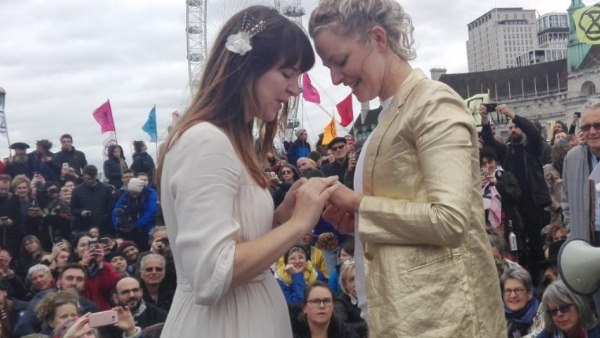लंदन। जलवायु परिवर्तन पर विरोध प्रदर्शन के लिए रविवार को लंदन की वेस्टमिंस्टर ब्रिज पर जब हजारों प्रदर्शनकारी इकट्ठा हुई थी। इस प्रदर्शन के दौरान एक अजीबो-गरीब नजारा देखने को मिला। टेम्स नदी के तट पर दो लड़कियों ने आपस में शादी रचाई। क्लाइमेट चेंज एक्टिविस्ट तमसिन ओमोंड और मेलिसा ने हजारों लोगों के सामने अपनी अनोखी शादी रचाई। इस दौरान वहां मौजूग सैकड़ों लोगों ने इस प्यारे जोड़े का आशीर्वाद दिया।