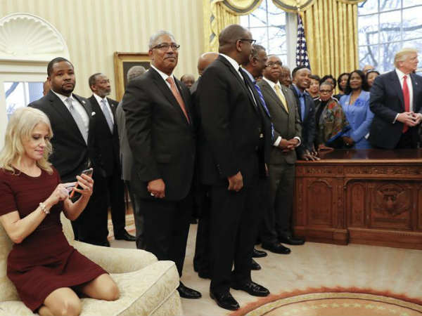 सलाहकार केलयानी कॉन्वे की जो फोटोग्राफ सामने आई है उसमें वह ऑफिस में एक काउच पर दोनों पैर ऊपर कर और घुटनों को मोड़कर बैठी हैं। यह फोटोग्राफ सोमवार की है जब राष्ट्रपति ट्रंप ब्लैक कॉलेजों और यूनिवर्सिटीज के नेताओं से मुलाकात कर रहे थे। एक और फोटो में कॉन्वे इस कार्यक्रम की इसी अंदाज में फोटोग्राफ क्लिक कर रही है। ट्विटर पर कुछ यूजर्स ने कहा कि इस फोटो से साफ पता लगता है कि ओवल ऑफिस में मौजूद ट्रंप और कॉन्वे और ट्रंप प्रशासन अश्वेत लोगों की कितनी इज्जत करते हैं। वहीं कुछ और यूजर्स ने पूर्व राष्ट्रपति बराक ओबामा की उस फोटोग्राफ को ट्वीट किया है जिसमें वह ऑफिस टाइम में अपनी डेस्क पर दोनों पैरों को फैलाकर बैठे हैं।