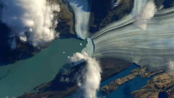 अर्जेंटीना के उप्साला ग्लेशियर की तस्वीर के साथ अंतरिक्ष यात्री थॉमस पेसक्वेट ने लिखा है कि 'नीले पानी में पहली बर्फ किसी तमाशे से कम नहीं है।'