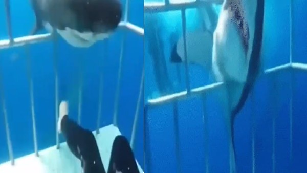 यह चौंकाने वाला हादसा उस वक्त हुआ, जब एक ग्रेट वाइट शार्क ने लोहे के पिंजरे में घुसने के बाद डरे हुए गोताखोरों पर हमला कर दिया। दरअसल, बड़े समुद्री जानवर की एक झलक पाने के लिए मैक्सिको के ग्वाडालूप द्वीप के शार्क से भरे पानी में दो गोताखोरों के उतरने के बाद यह घटना हुई। फोटो में देखा जा सकता है कि दो एडवेंचर लवर गोताखोर एक धातु के पिंजरे में पानी में लटके हुए दिखाई देते हैं, जबकि शार्क को तैरते हुए देखते जा सकता हैं। इतने में ही शार्क उनकी तरफ बढ़ती है।