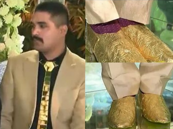 PICS: दूल्हे ने अपनी शादी में पहने सोने के कपड़े, 32 तोले के जूते तो 10 तोले की टाई