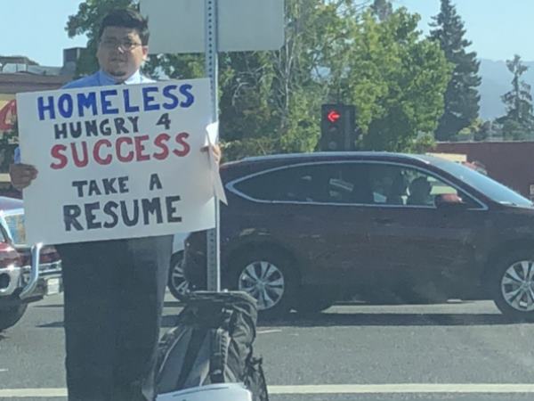 डेविड ने जो तख्ती हाथ में ली थी उस पर लिखा था- 'बेघर, सफलता का भूखा। कृपया रिज्यूम ले लें।' एक महिला ने रिज्यूम के साथ उनकी फोटो ट्विटर पर शेयर करते हुए लिखा कि इस नौजवान ने बेघर और बेरोजगार होते होने पर भीख या पैसा नहीं मांगा वो रिज्यूमे लेकर नौकरी मांग रहा है। सिलिकन वैली में कोई कुछ कर सकता है तो करे।
