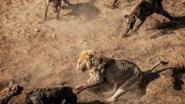 30 खूंखार लकड़बग्घे और जंगल के राजा शेर के बीच ये लड़ाई 6 घंटे से ज्यादा चलती रही। ये लड़ाई तब शुरू हुई जब शेर एक भैंस का मांस खाने की कोशिश कर रहा था। उसी वक्त लकड़बग्घों के झुंड ने शेर को चारों तरफ से घेर लिया और फिर शुरू हो गई भूख मिटाने की खतरनाक जंग। लड़ाई सिर्फ इस बात को लेकर हो रही थी कि भैंस का मांस किसे खाने को मिलेगा। लकड़बग्घे शेर को मार देना चाहते थे लेकिन शेर तो शेर होता है। 6 घंटे के अकेले 30 लकड़बग्घों से लड़ने के बाद भी शेर उनपर भारी पड़ा और साबित कर दिया कि यूं ही नहीं उसे जंगल का राजा कहा जाता है।