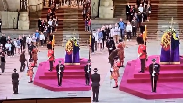 शख्स सैकड़ों लोगों की लाइन में लगे हुए हैं। सब बारी बारी से महारानी को श्रद्धांजलि अर्पित कर रहे हैं। इस बीच उस शख्स ने लाइन तोड़ते हुए बीच से निकलकर महारानी की अंतिम विदाई दी। वे हाथ जोड़कर एक सिक्का गिराते हुए रानी को नमन किया।