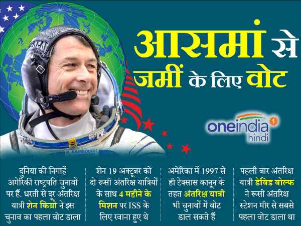 नई दिल्ली। दुनिया भर की निगाहें इस वक्त अमेरिका के राष्ट्रपति चुनाव पर टिकी हैं। हिलेरी क्लिंटन और डोनाल्ड ट्रंप में कड़ी टक्कर के बीच धरती से कोसों दूर अंतरिक्ष से इस चुनाव में पहला वोट डाला गया है।