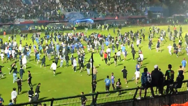 जकार्ता, 02 अक्टूबर। इंडोनेशिया में फुटबॉल मैच के दौरान बड़ी हिंसा का मामला सामने आया है। यहां मैच के दौरान हुई हिंसा में 174 लोगों के मारे जाने की खबर है। रिपोर्ट के अनुसार ईस्ट जावा में फुटबॉल मैच के बाद उग्र दर्शक पिच पर पहुंचकर एक दूसरे से भिड़ गए। इस हिंसा में 174 लोगों की जान चली गई, जिसमे 2 पुलिसकर्मी भी शामिल हैं। जानकारी के अनुसार स्टेडियम में 34 लोगों की मौत हुई, जबकि बाकी लोगों की अस्पताल में मौत हो गई।