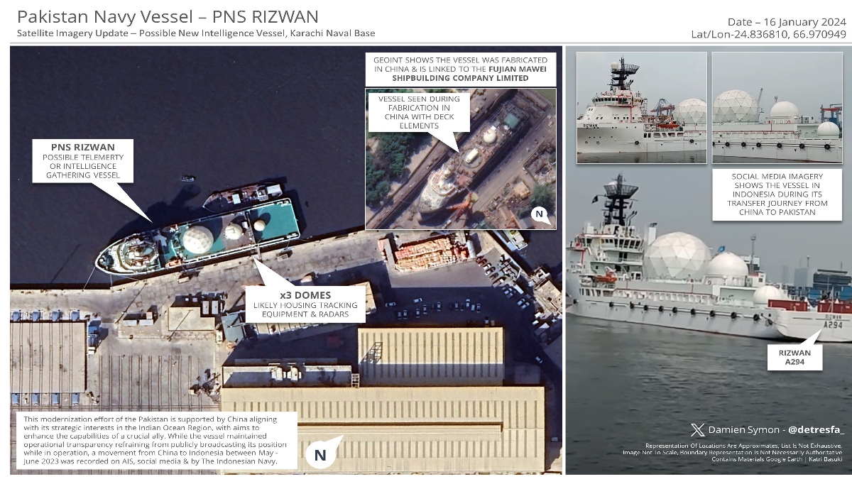 हालांकि, पीएनएस रिजवान नाम के इस जहाज को जून 2023 में पाकिस्तान नौसेना को सौंप दिया गया था, लेकिन उसके बाद से इंडोनेशियाई समुद्र में यात्रा करने के बाद 26 जून 2023 को कराची नौसैनिक यार्ड, पाकिस्तान समुद्री सुरक्षा एजेंसी (PMSA) बेस पर पहुंचा था, लेकिन पाकिस्तान ने इसे दुनिया से छिपाकर रखा हुआ था। जिसे अब चीन के इशारे पर पाकिस्तान ने भारत की जासूसी के लिए तैनात किया है। भारत सहित सिर्फ 14 देश ही अब तक ऐसे जहाजों को ऑपरेट करने वाले देशों में शामिल थे।