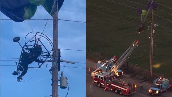 क्रैश का शिकार होकर बिजली के तारों में टंगा पैराग्लाइडर, क्रेन से उतारा गया, वीडियो वायरल
