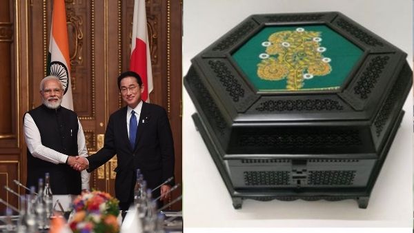 क्वाड शिखर सम्मेलन में हिस्सा लेने पहुंचे भारत के प्रधानमंत्री नरेंद्र मोदी ने मंगलवार को अपने जापानी समकक्ष फुमियो किशिदा को रोगन पेंटिंग भेंट के साथ एक लकड़ी का एक शानदार नक्काशीदार बक्शा भेंट किया।