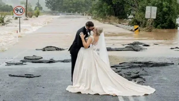 ये तस्वीर न्यू साउथ वेल्स के निवासी केट फोदेरिंघम और वायन बेल की है, जो कि 20 मार्च को शादी करने जा रहे थे। केट और वायन इससे पहले लिव इन रिलेशन में थे और केट इन दिनों गर्भवती हैं। शादी के जोड़े में सजा ये कपल 20 तारीख को अपने घर के पास के चर्च में शादी करने के लिए जा ही रहा था कि दोनों अपने घर के बाहर ही बाढ़ के पानी में फंस गए। बाढ़ के पानी में खुद को घिरा देखकर केट-वायन ने बिना समय व्यर्थ किए ट्वीट करके मदद मांगी, जिससे समय पर ही उनके पास मदद पहुंच गई।