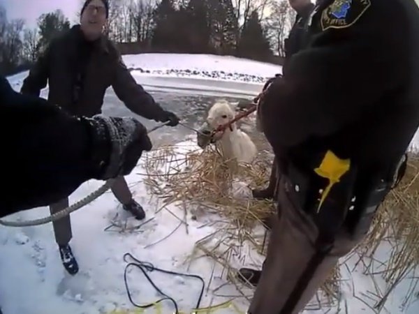 घोड़े को बचाने की जद्दोजहद में एक पुलिस वाला भी तालाब में जा गिरा। पुलिसवाले को फटाफट ठंडे पानी से बाहर निकाला गया। इसके बाद पुलिस वालों ने फायर डिपार्टमेंट को फोन कर बुलाया ताकि उसके आसपास की बर्फ काटी जा सके। फायर डिपार्टमेंट ने घोड़े के आसपास की सारी बर्फ काटी जिसके बाद उसे ऊपर खींचा गया। मैकॉम्ब काउंटी शेरिफ ने ये वीडियो फेसबुक पर शेयर किया है जो वायरल हो गया है। पुलिस की बर्फीले पानी में घुसकर घोड़े को निकालने के प्रयास की हर जगह तारीफ हो रही है।