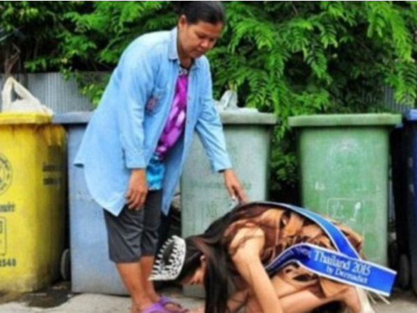 बैंकॉक। 17 साल की खानित्था पासायेंग ने हाल ही में 'मिस अनसेंसर्ड न्यूज थाईलैंड 2015' का खिताब अपने नाम किया है। इन दिनों खानित्था की तस्वीरें इंटरनेट पर वायरल हो गई हैं जिसमें वो एक महिला का पैर छूते नजर आ रही हैं। वो महिला कूड़ा बिनने का काम करती है। अब आप सोच रहे होंगे कि मिस थाईलैंड एक कूडा बिनने वाली महिला के पैर क्यो पड़ रही है तो हम आपको बता दें कि कूड़ा उठाने वाली ये महिला खानित्था की मां हैं।