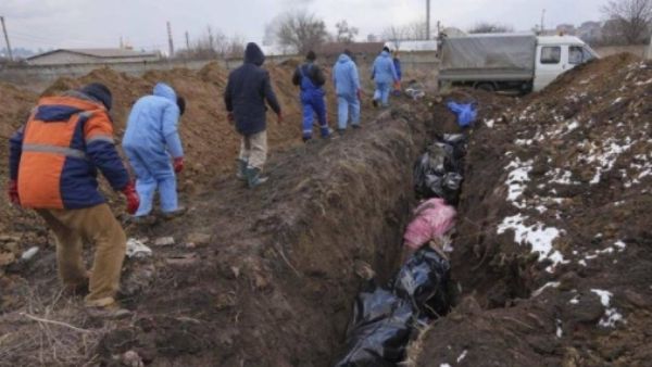 यूक्रेन में रूसी सैनिकों ने भीषण तबाही मचाई है और कई दर्दनाक तस्वीरें सामने आ रही हैं। सामूहिक तौर पर शवों को दफनाया जा रहा है।