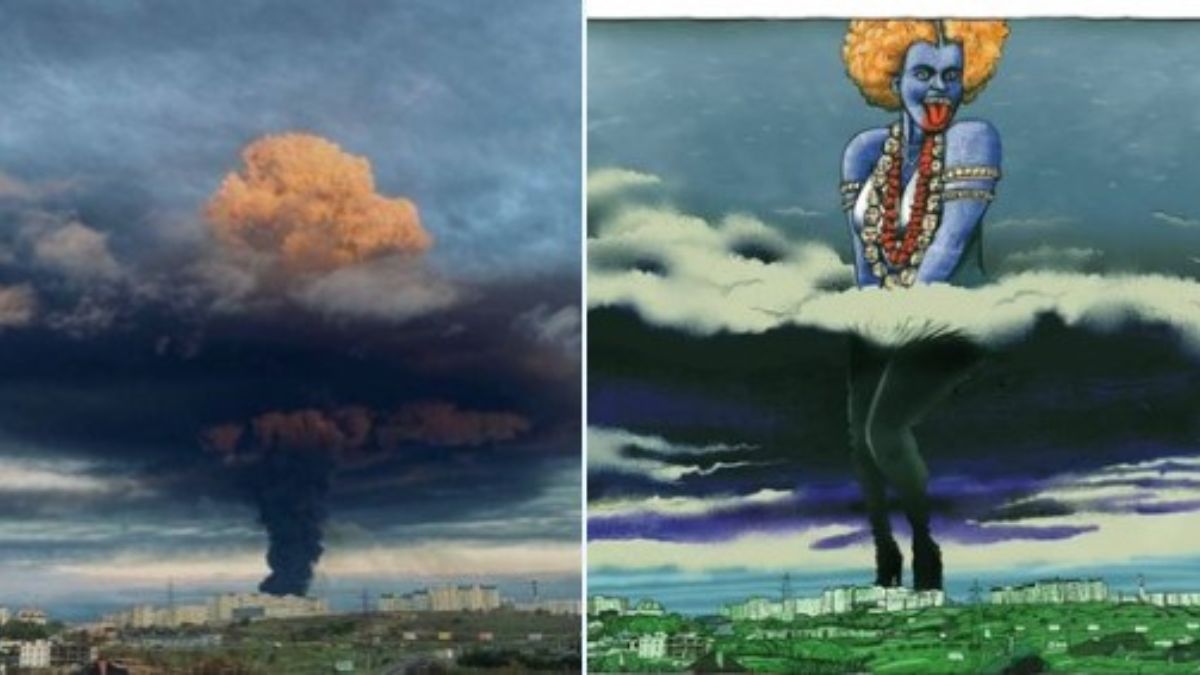 यूक्रेनी रक्षा मंत्रालय ने जो तस्वीर ट्विटर पर पोस्ट की है, उसमें दो तस्वीरों को आपस में मिलाया गया है। एक तस्वीर में बम धमाके के बाद आकाश में विस्फोट के गुबार को दिखाया गया है। वहीं, दूसरी तस्वीर में काली माता की विकृत तस्वीर को रखा गया है।