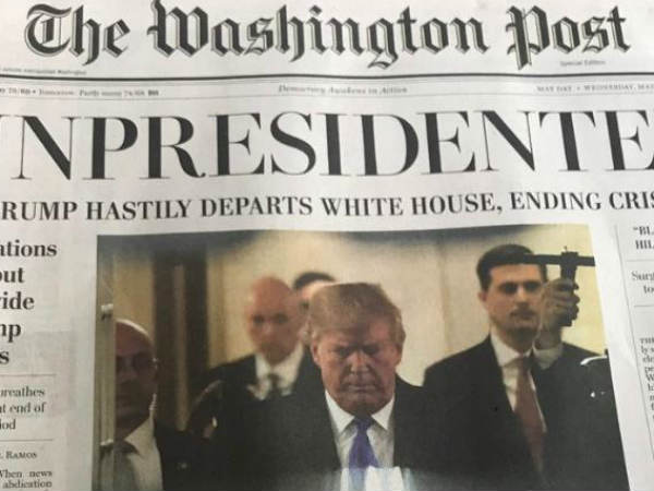इसमें कहा गया था कि राष्ट्रपति डोनाल्ड ट्रंप ने 30 अप्रैल 2019 को व्हाइट हाउस खाली कर दिया है। अखबार में लिखा था, 'ट्रंप ने किसी तरह का कोई औपचारिक बयान जारी नहीं किया है। हालांकि व्हाइट हाउस की तरफ से नाम न बताने की शर्त पर चार लोगों ने दावा किया है कि उन्हें राष्ट्रपति की ओवल ऑफिस की डेस्क से एक नैपकिन मिला है। 30 अप्रैल को मिले इस नैपकिम पर लाल रंग से एक संदेश लिखा है: हिलेरी और हफियॉर का दोष है और साथ ही फेक न्यूज मीडिया इसके लिए दोषी है।'इसके बाद वॉशिंगटन पोस्ट ने 'अनप्रेसीडेंट' इस हेडलाइन के नीचे लिखा था फेक न्यूजपेपर की स्टोरी में ट्रंप के इस्तीफे की बात कही गई है। एक और रिपोर्ट में कहा गया है कि ट्रंप के इस्तीफे के बाद दुनिया भर में जश्न का माहौल।