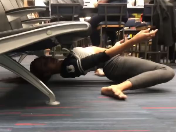 VIDEO: एयरपोर्ट पर लगी कुर्सियों के नीचे से निकल आई ये महिला, करतब देख लोगों ने बजाई तालियां