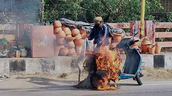 चलती स्कूटी की टंकी फटने से लगी आग, दो युवतियों ने सड़क पर कूदकर बचाई जान