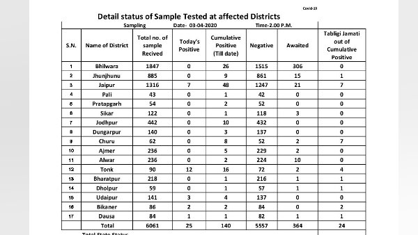 Covid-19 Rajasthan : एक दिन में 25 कोरोना पॉजिटिव, सबसे ज्यादा 12 टोंक में, कुल 161 केस