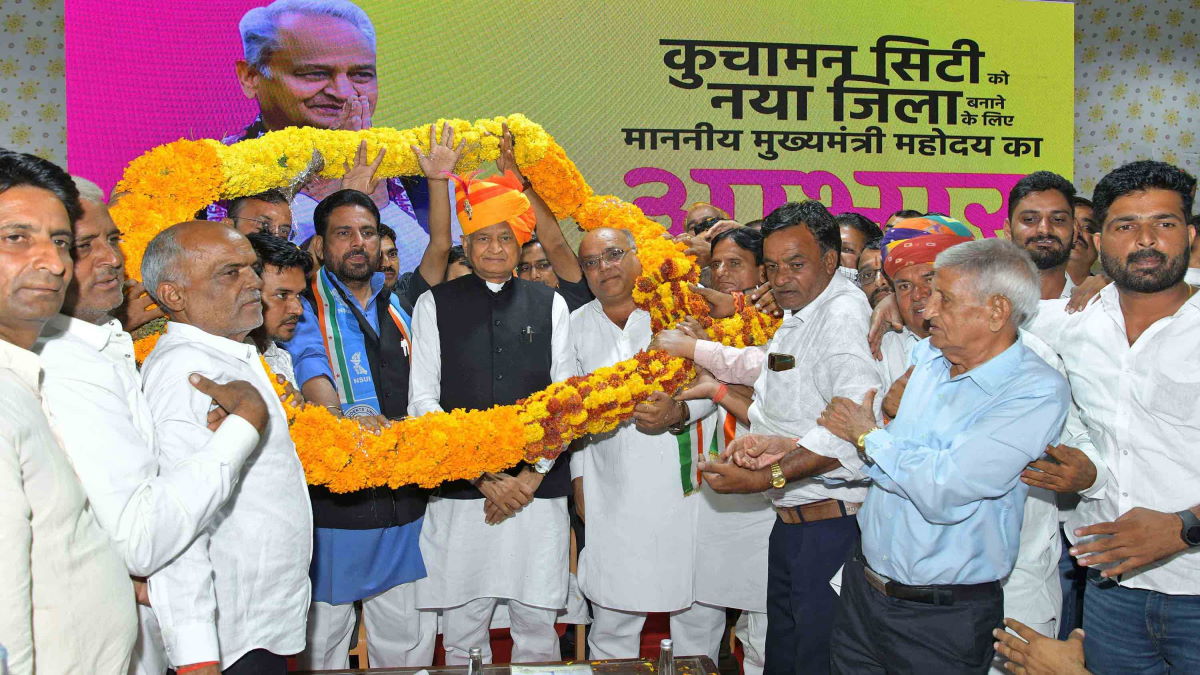 इस अवसर पर उप मुख्य सचेतक महेन्द्र चौधरी ने कहा कि सीएम गहलोत ने क्षेत्रवासियों की अपेक्षाओं को पूरा करते हुए कुचामन जिले के गठन को स्वीकृति दी है। इससे क्षेत्र की जनता में उत्सव का माहौल है। जाकिर हुसैन गेसावत ने कहा कि राज्य सरकार की योजनाओं से क्षेत्र का निरन्तर विकास हुआ है। इस अवसर पर लच्छाराम बडारडा सहित बड़ी संख्या में कुचामन से आया जनसमूह उपस्थित रहा।