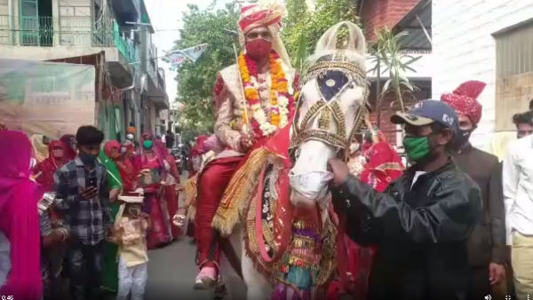 कोरोना काल में एक ऐसी बारात दूल्हा और बारातियों ने मास्क लगाए, घोड़ी को भी Mask पहनाया