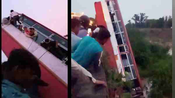 कानपुर: रेलिंग तोड़कर नदी में सीधी खड़ी हो गई बस, इस तरह बचाई लोगों ने जान
