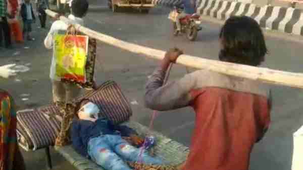 कानपुर: बीमार बेटे को चारपाई पर लेकर लुधियाना से एमपी की तरफ पैदल ही चल पड़ा लाचार पिता