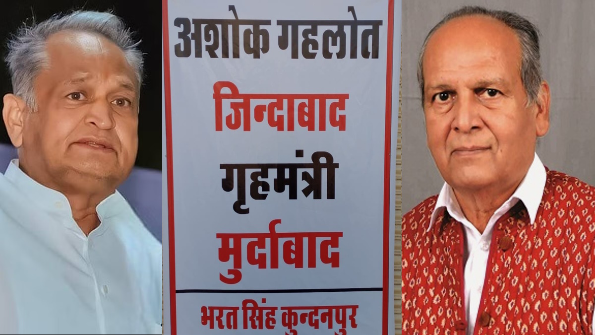 CM Ashok Gehlot vs MLA Bharat Singh Kundanpur: राजस्थान विधानसभा चुनाव 2023 की तारीखों के ऐलान से पहले कांग्रेस विधायक भरत सिंह कुंदनपुर के घर के बाहर लगा एक पोस्टर सुर्खियों में है। पोस्टर पर लिखा है 'अशोक गहलोत जिंदाबाद, गृहमंत्री मुर्दाबाद'
