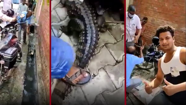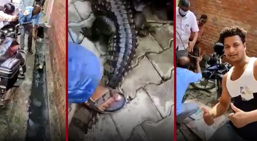 VIDEO: नदी से घर की नाली में आ घुसा मगरमच्छ, लोगों ने ली सेल्फी, बोले- शरमा रहा है